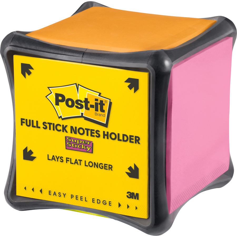 Always have a note where you need it with this playful notes holder. Soft-touch corners encourage tossing, fidgeting and spinning at your desk. Six compartments hold six different 3″ x 3″ pads of Post-it Super Sticky Full Adhesive Notes. It’s also a great way to organize numerous pads into one small area. Six slots make it easy to color-code projects or tasks. The Full Stick Notes feature adhesive on the majority of the backside of the note, allowing each note to lie flat longer to keep your message neat. Easy peel edge with indicator lets you peel a note from your pad with ease. Use for brainstorming or leave in high-traffic conference rooms or areas. Holder includes six 3″ x 3″ pads in assorted bright colors. The paper in Post-it Super Sticky Notes is sourced from certified, renewable and responsibly managed forests.
