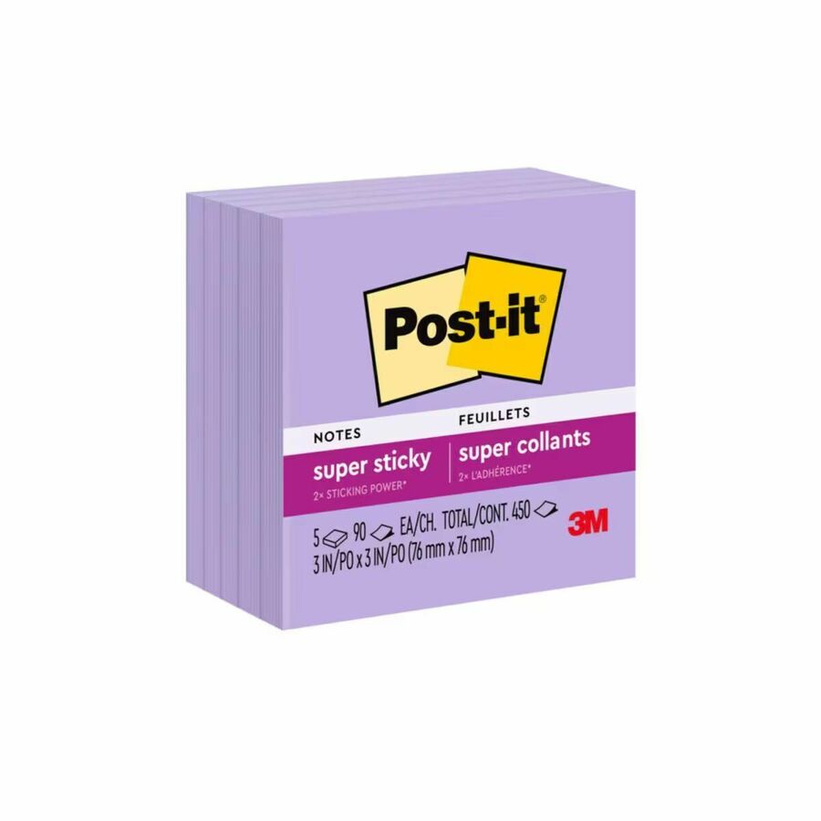 Post-it® Super Sticky Notes in 3 in. x 3 in. feature 2x the sticking power. Use for notes or reminders on doors, windows or walls. Unique adhesive reliably sticks and re-sticks so your message can stay front and center. Move your notes with you throughout the day. Orchid Frost color is great for lavender lovers, or for creating murals or works of art with Post-it® Super Sticky Notes. Post-it® Super Sticky Notes are recyclable and the paper in Post-it® Super Sticky Notes is sourced from certified, renewable and responsibly managed forests. 5 Pads/Pack, 90 Sheets/Pad.