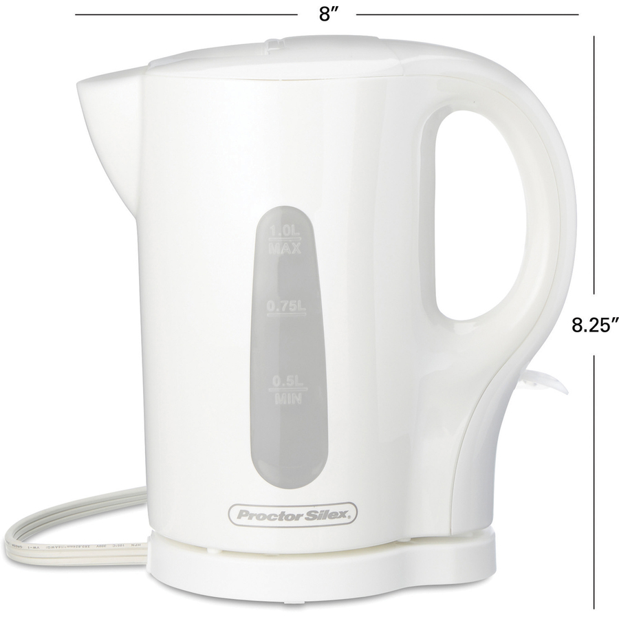 Marketing Information:Electric kettle features an immersed heating element to bring one liter of water to a rolling boil in a few short minutes. Easy-to-read water window indicator lets you see your water level at a quick glance. On/off light lets you see when the unit is operating. Kettle automatically shuts off when the water boils. Boil dry safety shutoff prevents operating when the reservoir is empty to protect the unit from damage. Drip-free pouring spot prevents messes and spills.