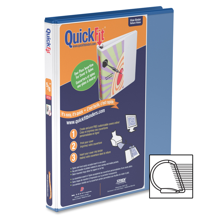 Angle-D ring presentation binder offers a unique open-spine design to allow easy placement of spine inserts in half the time of conventional overlays. Quickfit overlay allows you to use a single sheet of paper to create a custom insert that wraps around the spine to the front cover for easy insertion and quick identification. Ink transfer-resistant overlay and interior front and back cover pockets resist sticking to inks to maintain clean appearance. Binder is perfect for computer-generated graphics, presentations and catalogs. Templates for overlay inserts are available online.