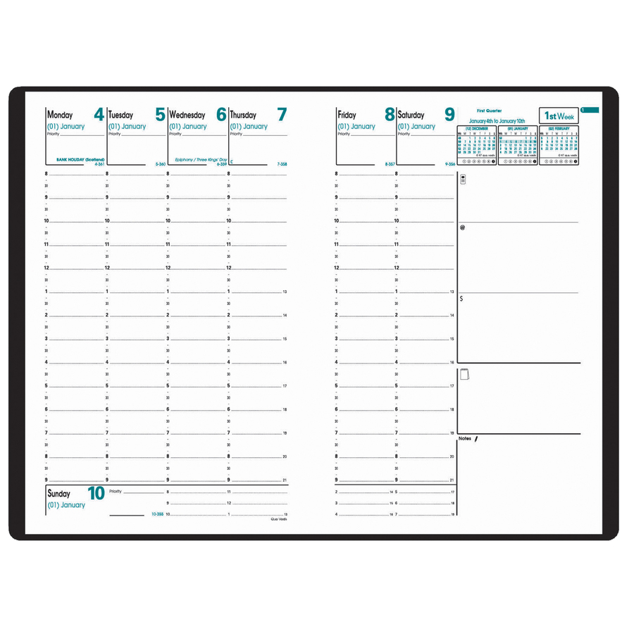 Compact weekly planner is ideal for the briefcase. Planning pages range 13 months from December to December. Two-page-per-week spreads offer appointment times from 8 AM to 9 PM, notes sections and reference months. Use the tear-off corners to open to the week in progress. Sewn binding lets planner lie flat when open. Crisp, two-color print is in gray and teal for easy scanning. Extra white, super smooth paper is acid-free and pH neutral. Planning diary also includes a detachable address book, annual planning calendars, receipts/payments pages, maps and vinyl cover. Refillable.