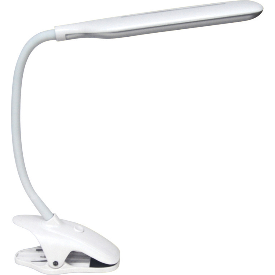 LED desk lamp with 440 lumens features an extra-long, adjustable neck to direct light exactly where you need it. Clip-on base mounts instantly to quickly attach this lamp in a convenient location. LED bulb brightly illuminates your work area with white natural light using less power for cost-efficient use. Three-step dimming allows you to adjust your level of brightness to help minimize eyestrain.