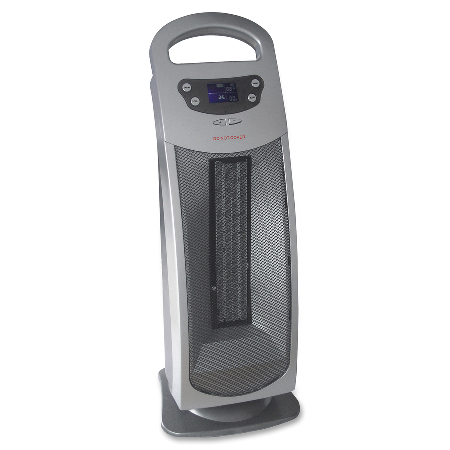 Stylish, tower-style ceramic heater features a user-friendly digital control panel and includes full-function remote control for added convenience. Oscillating function evenly distributes heat. Design features two heat settings, cool/warm/hot mode selections, adjustable room thermostat, automatic temperature control, overheat protection, safety tipover switch, wide-angle oscillation, carry handle, digital display, remote control and a 12-hour timer.