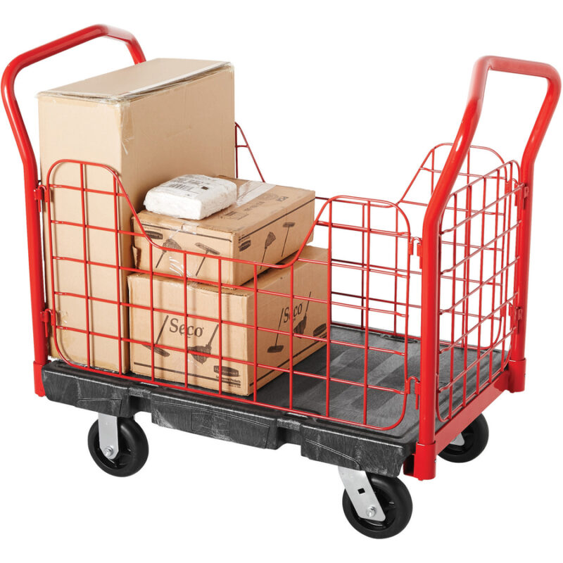 Side Panel Platform Truck is ideal for transporting and retaining small packages and materials. Heavy-duty, powder-coated, wire side panels easily retain small items. Remove one, two, three or all four side panels to accommodate oversized loads. Side panel cut-outs allow ergonomic access to your load. Duramold precision-engineered resin and metal composite structure provide unsurpassed durability and service life for maximum load support. Molded-in, tie-down slots offer load security. Textured deck surface (24″ x 36″) reduces load slippage. Perimeter deck channel retains small items. For built-in safety, retainer clips prevent unintended handle removal. Handle is also made of powder-coated steel for optimum service life. TPR casters provide floor surface protection, quiet operation and shock absorption. Capacity is 1,000 lb.
