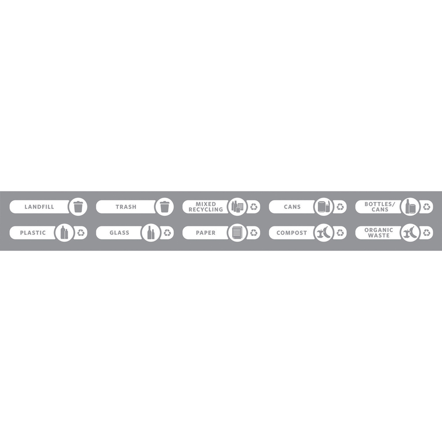 Expert-designed waste stream labels feature three visual cues: the recycling symbol, a stream icon and waste description proven to increase recycling effectiveness. Labels are sized for Brute containers, horizontal Slim Jim recycling lids, Untouchable containers, Rollout containers, and tilt truck placards. The 10 label options include mixed recycling, paper, plastic, glass, cans, bottles/cans, compost, organize waste, landfill and trash.