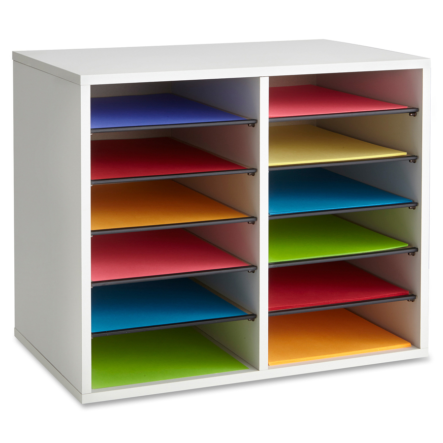 Literature organizer offers a versatile design that is perfect for desktop literature organization. Shelves are adjustable or removable to customize the compartments and keep supplies at hand for quick access. 10 hardboard shelves form up to twelve 9″ wide x 11-1/2″ deep x 2-3/8″ high letter-size compartments and support up to 15 lb. Organizer is made with hardboard shelves, solid fiberboard back and a laminate finish.