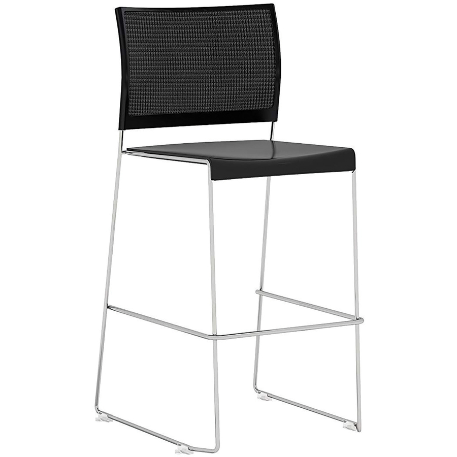 Currant Bistro-Height Stack Chairs are ideal for multipurpose rooms, conference centers, breakrooms and cafeterias. They are easy to stack, store and rearrange with plenty of grooved areas for fingers to grip. Black mesh back provides comfortable breathability. Solid steel rod frame with a chrome-plated finish provides a sturdy and stable office seating option that is light enough to handle and move frequently. Ganging glides connect chairs to keep areas neat. Chairs stack up to five high on the floor and up to 35 high on a cart (not included). Seat measures 17-3/4″ wide x 18-1/2″ deep x 30″ high. Back size is 19-3/4″ wide x 13″ high.