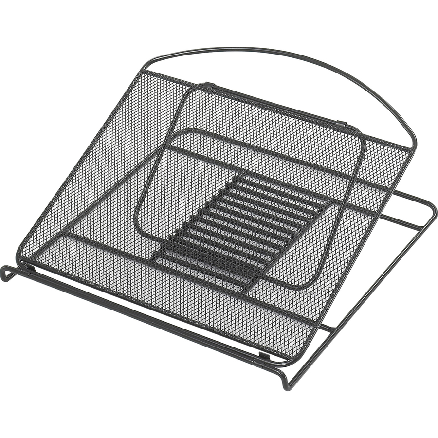 Well-ventilated laptop stand easily adjusts your standard laptop for comfortable viewing. Fold flat for portability. Stand is made of durable steel mesh for strength, stability and style and is Greenguard Certified. Platform size is 12″ wide x 12″ deep.