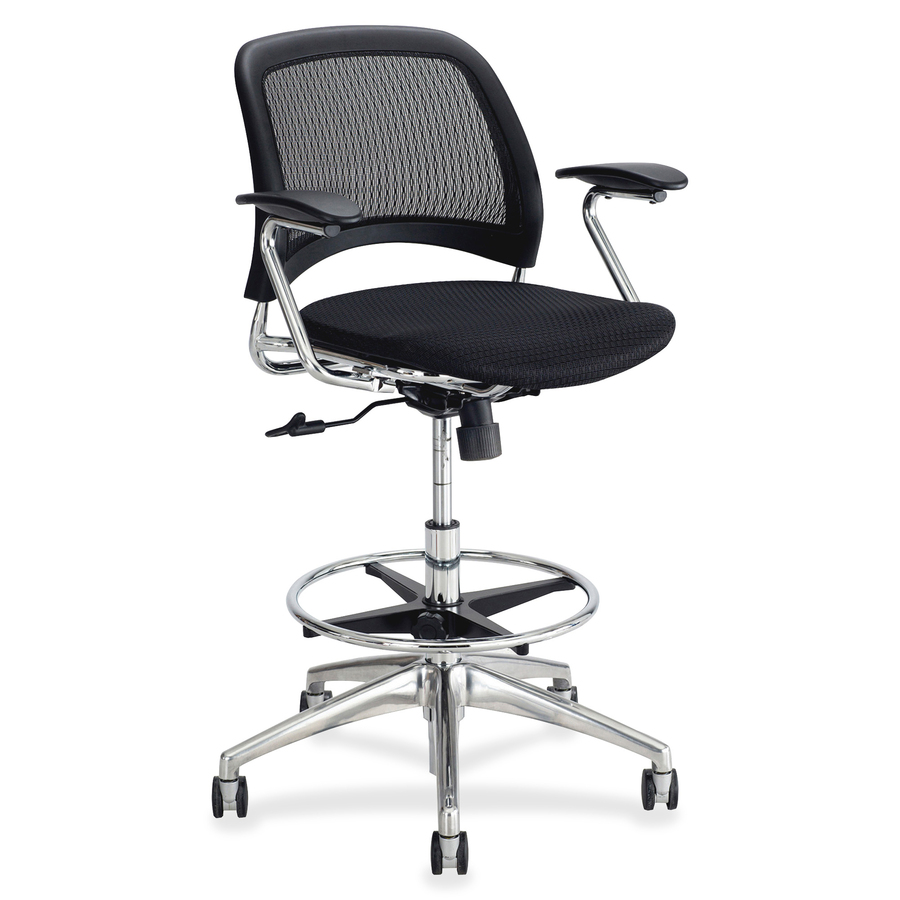 Reve Seating gives you a new reason to daydream. This extended-height stool is perfect for standing-height workstations. It features a full mesh back and cushioned seat. Great for any work space around the office or a great look in the home office, this stool is accented with a silver frame and comes with fixed arms to ensure a more relaxing way to sit through your workday. Functions include adjustable seat height from 25″ to 35″ , 360-degree swivel, tilt, tilt tension and tilt lock. Rounded back measures 18-1/2″ wide x 15″ high. Upholstered, cushioned seat size is 18″ wide x 17-1/2″ deep. The 26″ five-star, aluminum base is equipped with 2-1/2″ two-tone, dual-wheel carpet casters so you don’t have to leave your comfortable seat to move around your work space. Weight capacity is 250 lb.