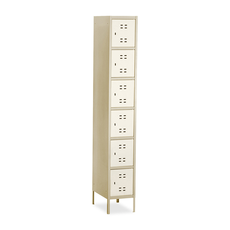 Six-tier, two-tone lockers feature legs, ventilation slits, and a strong, one-piece design with heavy-gauge, all-steel construction. Use as a stand-alone or link with other lockers. Set of lockers includes a compartment on each tier. Recessed handle with padlock provision has no protruding parts.