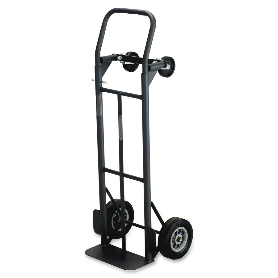 Convertible hand truck is functional and built to last. Versatile design easily converts from a two-wheeled hand truck to a four-wheeled platform truck. Simply slide handle out of one set of tubes and into another. Two-wheel position holds 400 lb. Four-wheel position holds 500 lb. Heavy-gauge, tubular steel frame has welded joints for extra strength, powder-coat finish and a 14″ x 7″ toe plate. 8″ solid rubber wheels have ball bearings and 4″ solid rubber casters.