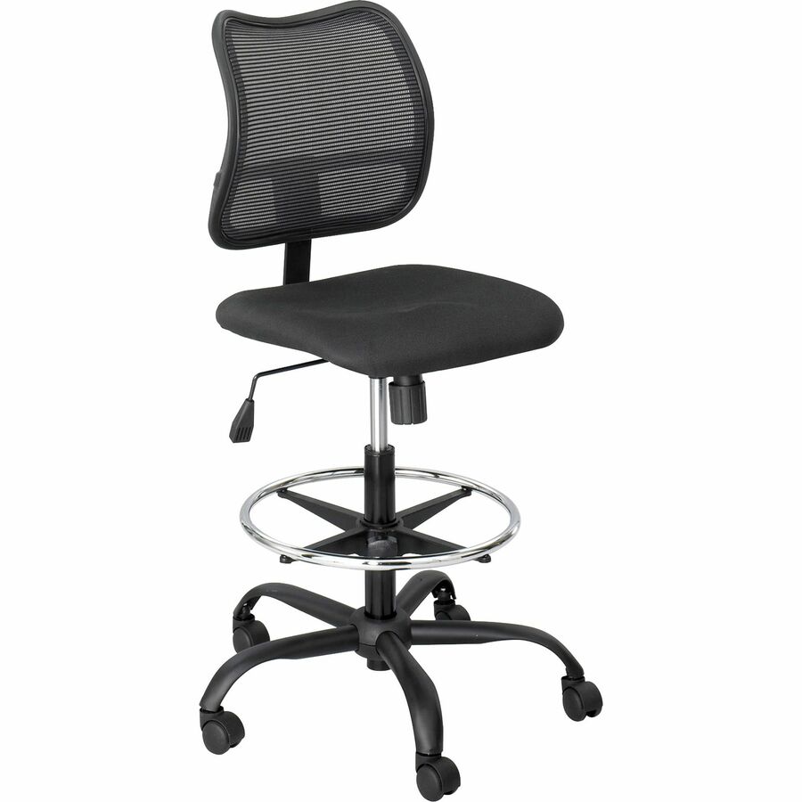 Extended-height mesh chair features black mesh fabric back, a black polyester fabric seat and a footring. Comfortable, ergonomic, height-adjustable seat is designed for all-day comfort and prevents fatigue. Chair holds up to 250 lb. Seat height adjusts pneumatically from 23″ to 33″. Other functions include tilt, tilt tension, tilt lock and 360-degree swivel. Seat size is 18″ wide x 17-1/2″ deep. Back measures 17″ wide x 15-1/2″ high. 25″ five-star base has 2″ hooded dual-wheel carpet casters. Loop arms are sold separately. Chair meets applicable ANSI/BIFMA standards.