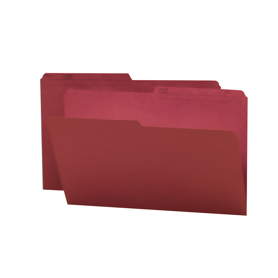 Reversible colored file folders offer wide 1/2-cut, single-ply tabs that are printed on both sides with “NAME/NOM: NO.” This makes it possible to use them in straight line filing systems with tab in either first or second position. Just fold front panels around to create the opposite tab position. Color-coding speeds filing and retrieval time while minimizing misfiles. File folders are made with 11 point colored stock and scored for 3/4″ expansion. Front panels are undercut. Top corners are rounded, front and back. Folders contain post-consumer recycled material and are SFI Fiber Sourcing Certified.