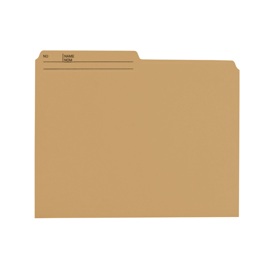 Single ply tab reversible file folders include wide 1/2-cut, single-ply tabs printed on both sides with “name/nom: no.” This makes it possible to use them in straight line filing systems with tab in either first or second position. Just fold front panels around to create opposite tab position. Front panels are undercut and top corners are rounded front and back. Single ply tab reversible file folders are scored for 3/4″ expansion.