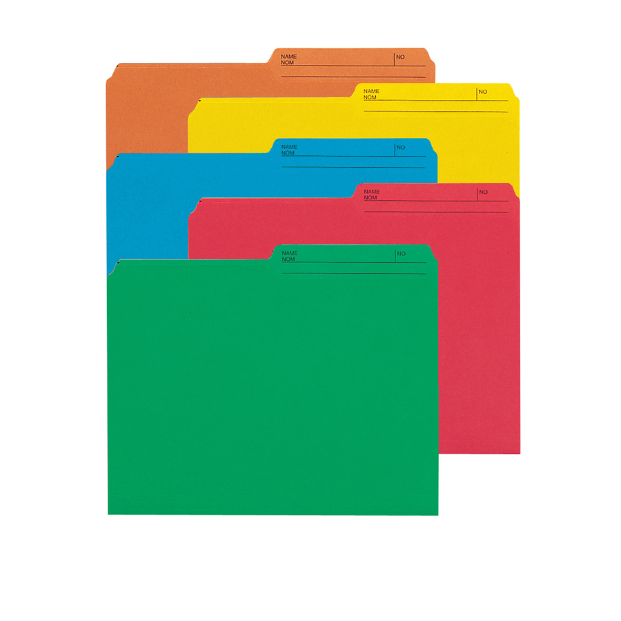 Reversible colored file folders offer wide 1/2-cut, single-ply tabs that are printed on both sides with “NAME/NOM: NO.” This makes it possible to use them in straight line filing systems with tab in either first or second position. Just fold front panels around to create the opposite tab position. Color-coding speeds filing and retrieval time while minimizing misfiles. File folders are made with 11 point colored stock and scored for 3/4″ expansion. Front panels are undercut. Top corners are rounded, front and back. Folders contain post-consumer recycled material and are SFI Fiber Sourcing Certified.