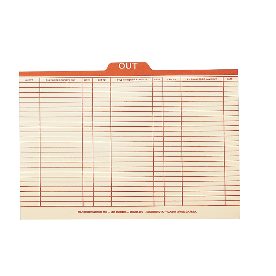 Out guides put an end to lost folders by clearly marking where folders have been removed. Simply insert the out guide in the file’s place. Preprinted forms on the out guide indicate which file has been taken, who is using it and the date taken. Each side of the out guide has 150 entry spaces. A red OUT tab on the top of the folder and in the 1/5 cut center position facilitates quick identification. 1/2″ high tabs are printed in reverse type. Out guides are made of 18 point stock.
