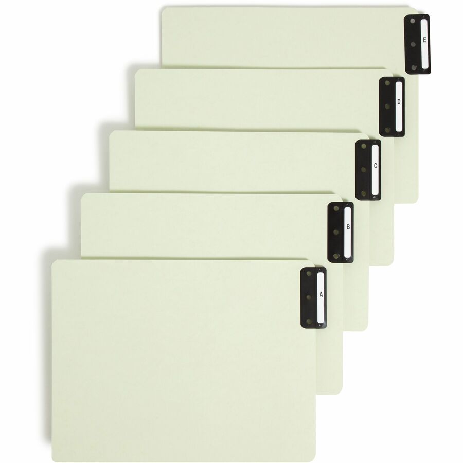 End-tab Pressboard Guides are used to divide entire filing systems into smaller groups for quick identification. Alphabetical tabs are readable from both sides for quick reference while filing. Guides are wider than standard end-tab folders so tabs stand out. 25 point green Pressboard is durable for frequent use. 1/2″ wide tabs with vertical style No. 8 are in the top position. Each end-tab guide includes a flat metal tab. Guides are made with a high percentage of recycled material.