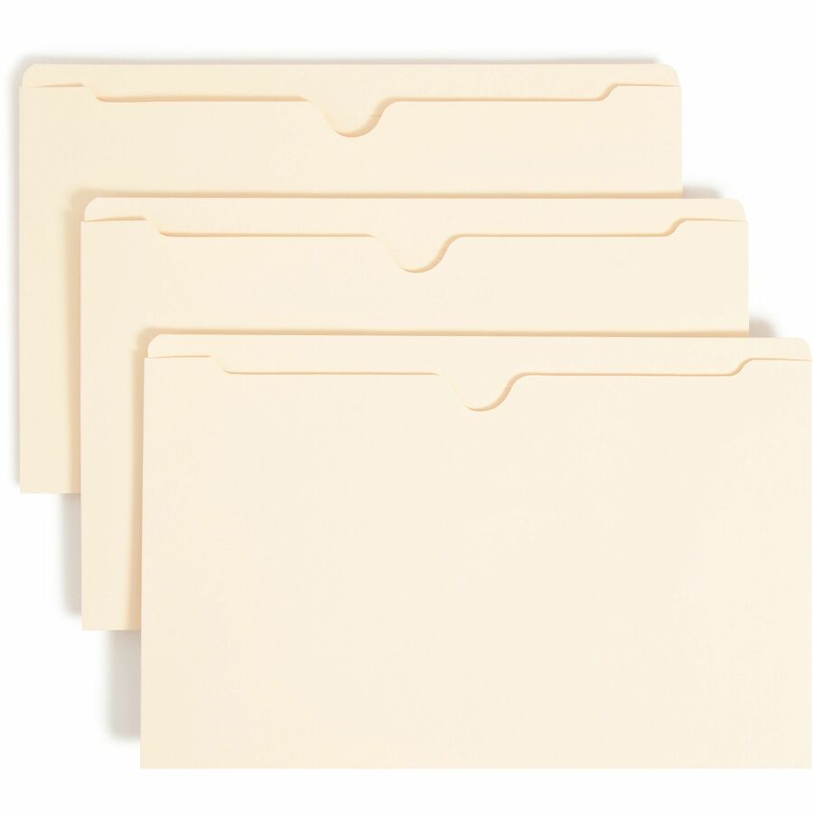 Manila file jackets feature full-height gussets to keep materials from slipping out. The 1/2″ high, two-ply reinforced, straight-cut tab with thumb-cut design allows easy access. Legal-size file jackets are scored 3/4″ and made of 11 point stock.