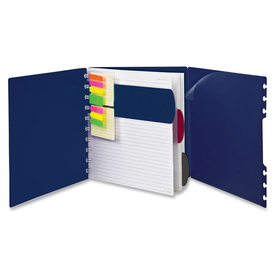Versa Crossover Notebook is completely customizable with a variety of repositionable accessories to organize, highlight and group your notes. The letter-size notebook features a durable navy poly cover and comes with 60 legal/wide-ruled sheets of specially punched paper; three tabbed dividers; 105 stick-on flags for labeling and highlighting; two 30-sheet, ruled, stick-on task pads for lists and memos; and a clear, dual-pocket, poly sheet protector to separate and hold papers. Back cover features two additional pockets and folds out to hold loose sheets.