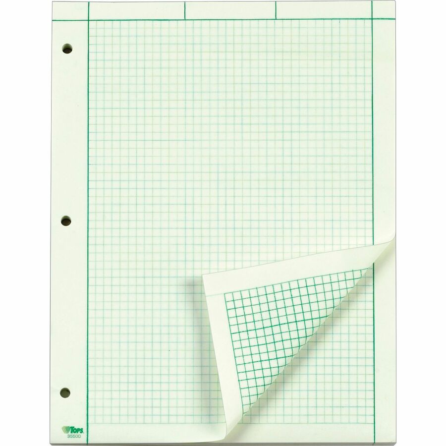Computation pad features a 5-square-per-inch, cross-section ruling printed on back that faintly shows through to the front. Front is printed with frame margins. Design makes diagramming easier. Three-hole punched pad has holes drilled in the left margin to fit in three-ring binders and is glue-bound along that side. Eye-ease green tint paper reduces glare and eyestrain. Letter-size computation pad contains 100 sheets of 16 lb. paper and has a 27 point chipboard back for writing support.