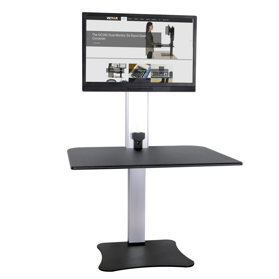 Marketing Information:Transform any sit-down desk into a sitting or stand-up desk with the DC400 Electronic Standing Desk Workstation. The 28″ wide x 23″ deep worksurface is raised up to 20″ for ergonomic placement of monitor, keyboard, mouse, telephone and papers while standing. Electric motor design allows easy custom height adjustment with the push of a button. Monitor holder is also height-adjustable with a range of 12-1/2″. To switch to sitting position, simply push a button and lower the surface down to desktop level. Safety Sensor stops movement when obstacles are detected under the desk. Sleek wood construction and a durable laminate coating provide years of use with a modern style. Sturdy steel base and aluminum tower are built to last. This standing desk converter rests on top of any desk or table. With no attachments to tie you down, it easily repositions. It holds one monitor of any size up to 25 lb. Standard VESA mounting holes are required.