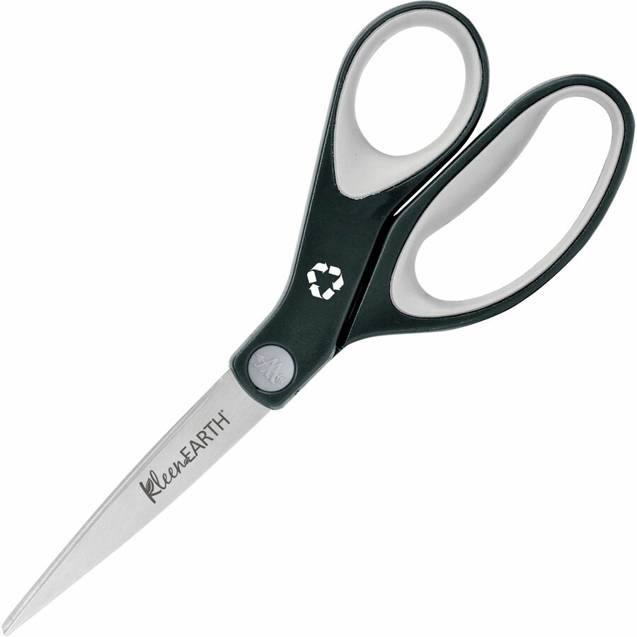 8″ lightweight scissors are designed for comfort and precision control. Comfortable, ambidextrous soft handle is earth-friendly. Straight black handles contain a high percentage of recycled plastic. Sharp blades are made of precision-ground stainless steel for durability. KleenEarth Soft Handle Scissors are designed for left-handed or right-handed users.