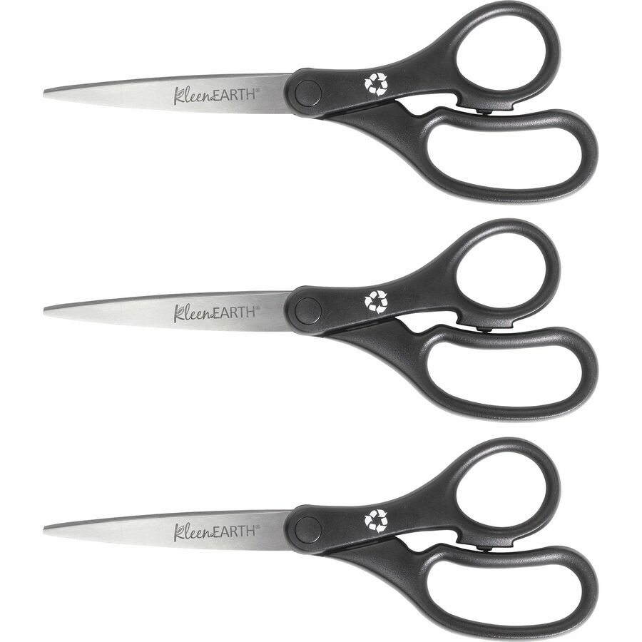 8″ lightweight scissors are designed for comfort and precision control. Comfortable, ambidextrous basic handle is earth-friendly. Straight black handles contain a high percentage of recycled plastic. Lightweight, sharp blades are made of precision-ground stainless steel for durability. KleenEarth Basic Recycled Scissors are designed for left-handed or right-handed users.