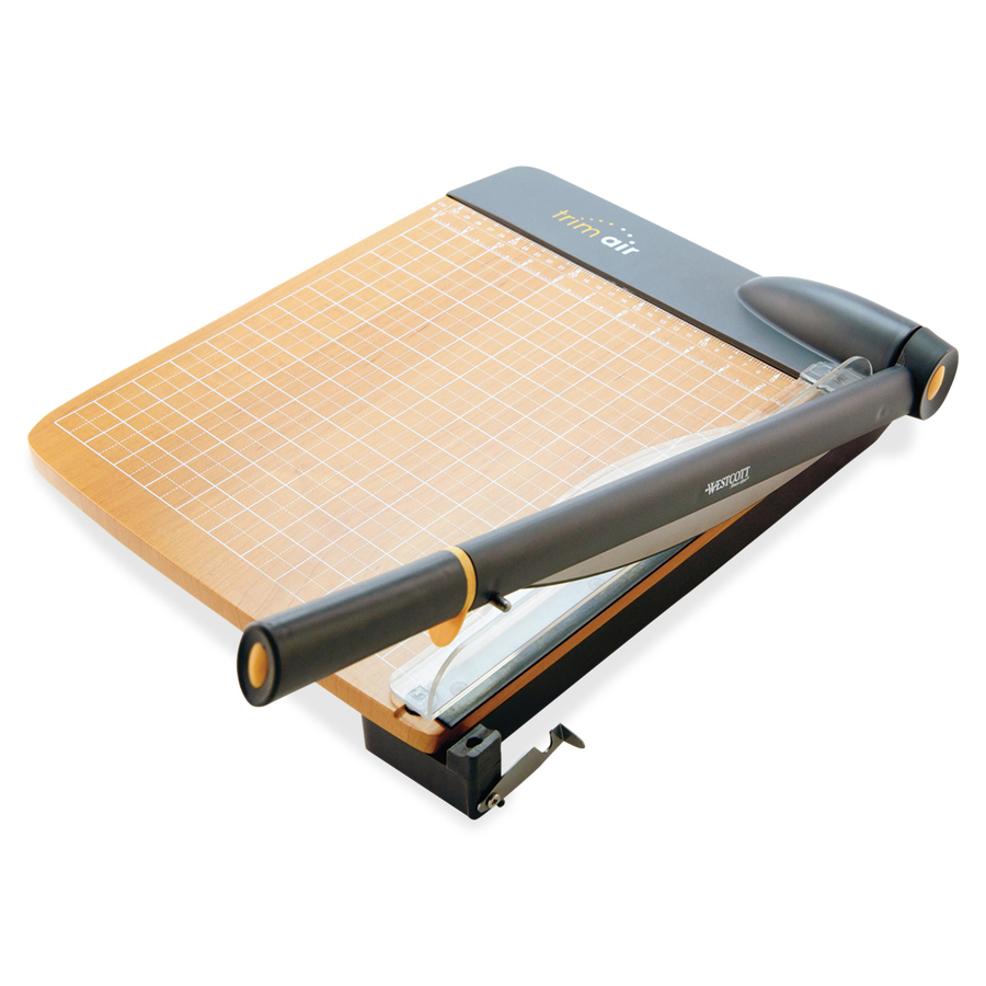 Guillotine trimmer features an ergonomic handle infused with antimicrobial product protection to inhibit the growth of bacteria. 15″ titanium-bonded blade cuts up to 30 sheets of 20 lb. paper. Blade is curved for optimum cutting performance. Contemporary design features a wood base, comfortable handle with safety guard, safety lock and transparent safety guard to keep fingers safe.