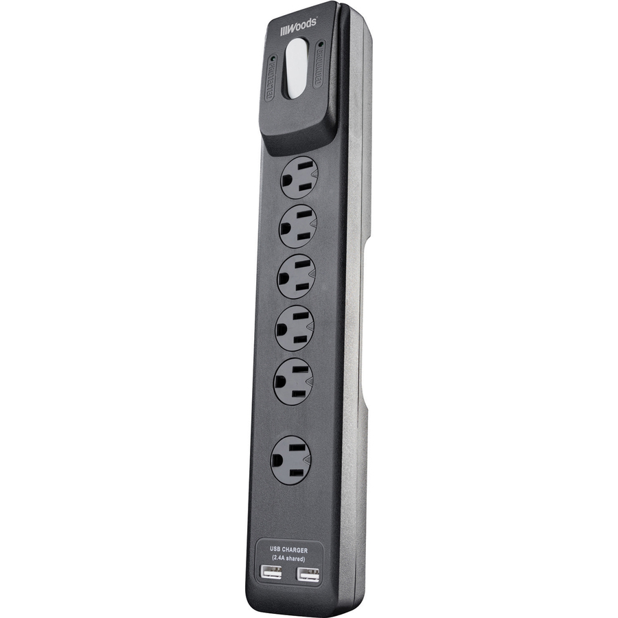 Six-outlet surge strip with 1780 joules of protection features a convenient outlet that’s spaced further away to accommodate larger adapters. Two 2.4A USB ports let you easily charge smartphones, e-readers, MP3 players and more. LED indicators show you when surge protection is active to ensure your devices are safe. Safety cover prevents accidents and protects the unit from dust and debris. Flat, right-angle plug sits close to the wall to fit easily behind furniture. Surge protector also features overload protection and an on/off power switch.