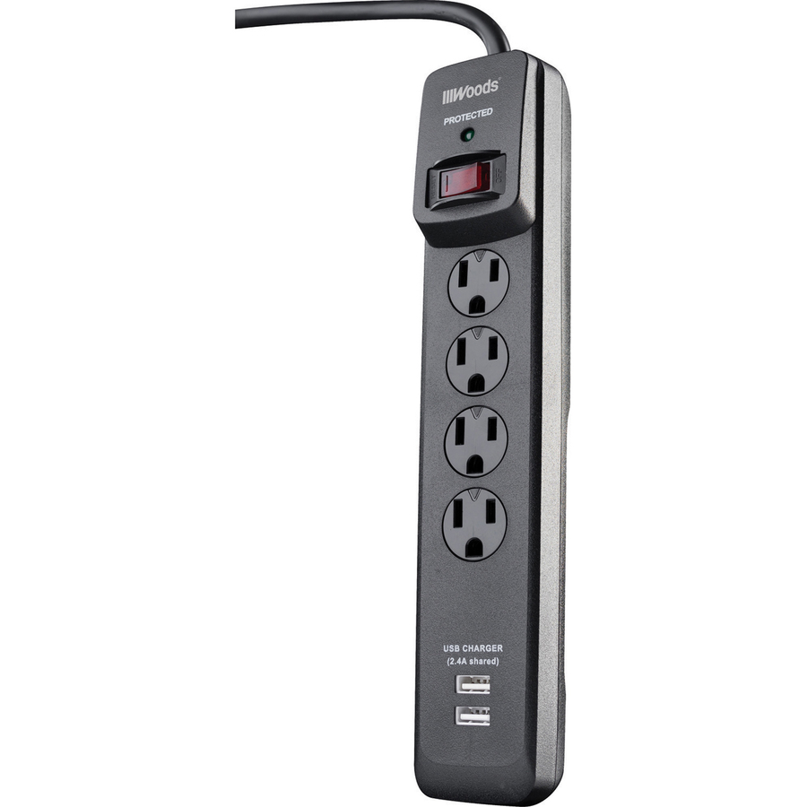 Four-outlet surge protector provides 1180 joules of protection to keep your electronic devices safe from sudden surges and spikes in power. Two 2.4A USB ports let you easily charge smartphones, e-readers, MP3 players and more. LED indicator shows you when surge protection is active to ensure your devices are safe. Safety cover prevents accidents and protects the unit from dust and debris. Surge protector also features overload protection, on/off power switch and 3′ cord.